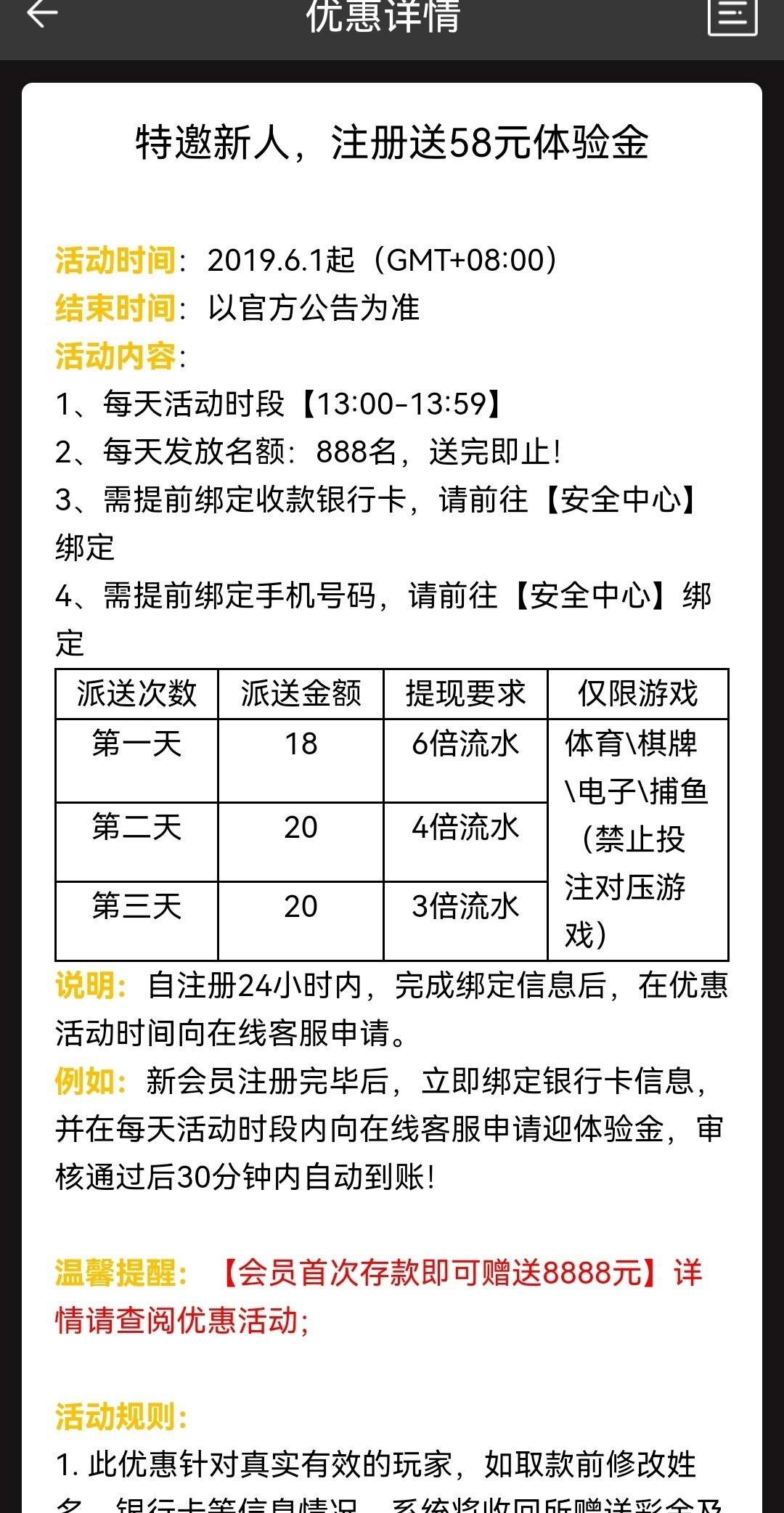活动:新用户注册绑卡绑定手机号,联系在线申请58彩金,第一天送18第二天20第三天20