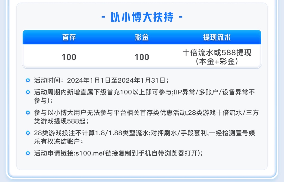 活动:新用户首存100+100(只能娱乐电子游戏,井且满足10倍流水即可无限制提款或者最低提款588元)首存活动只能参加一个参加100+100其他首存活动都无法参与,本活动仅限独立账户参与,如同一姓名、同一手机号、同一IP.同一银行卡账户多账户均不参与,该活动需要在未下注前申请