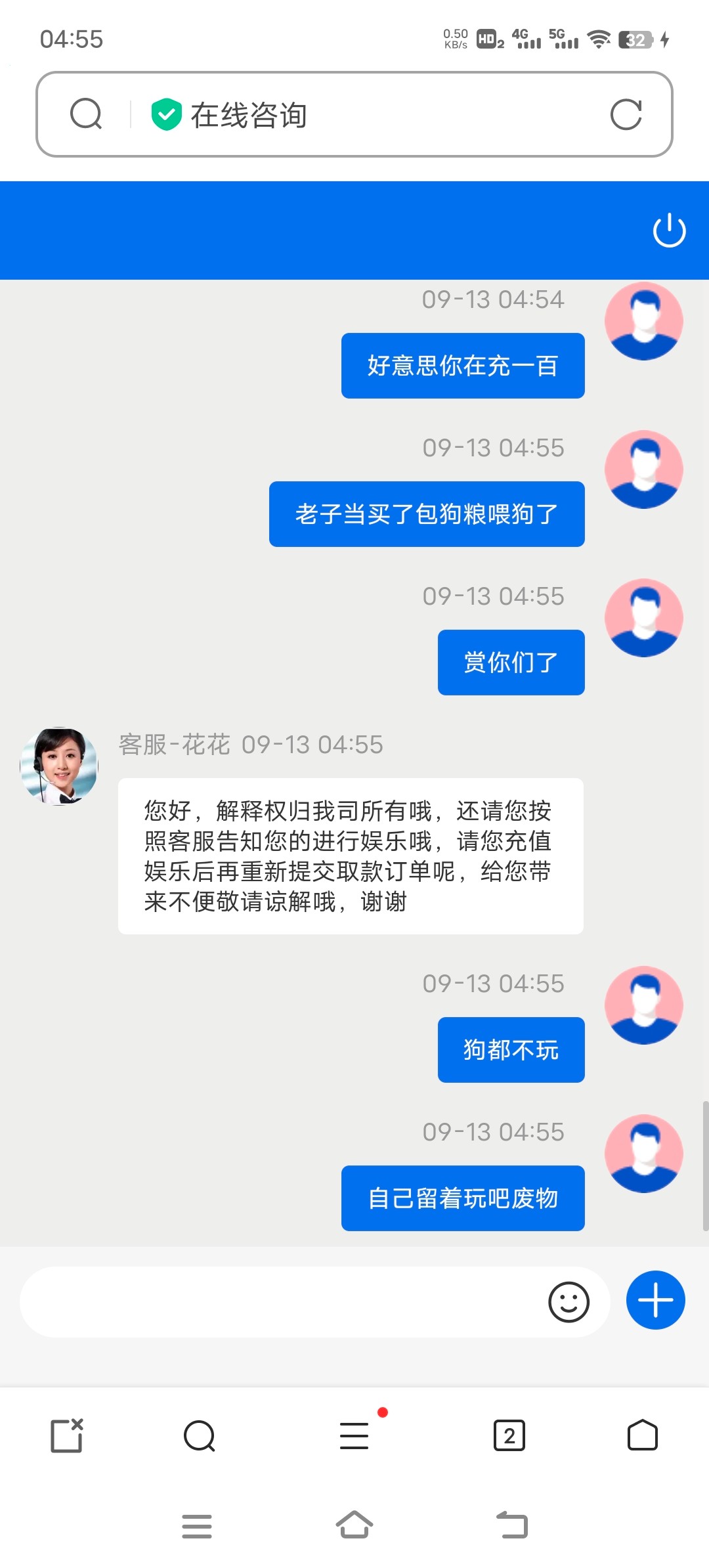 讨口子,100的充值也要来发论坛,有毛病一样