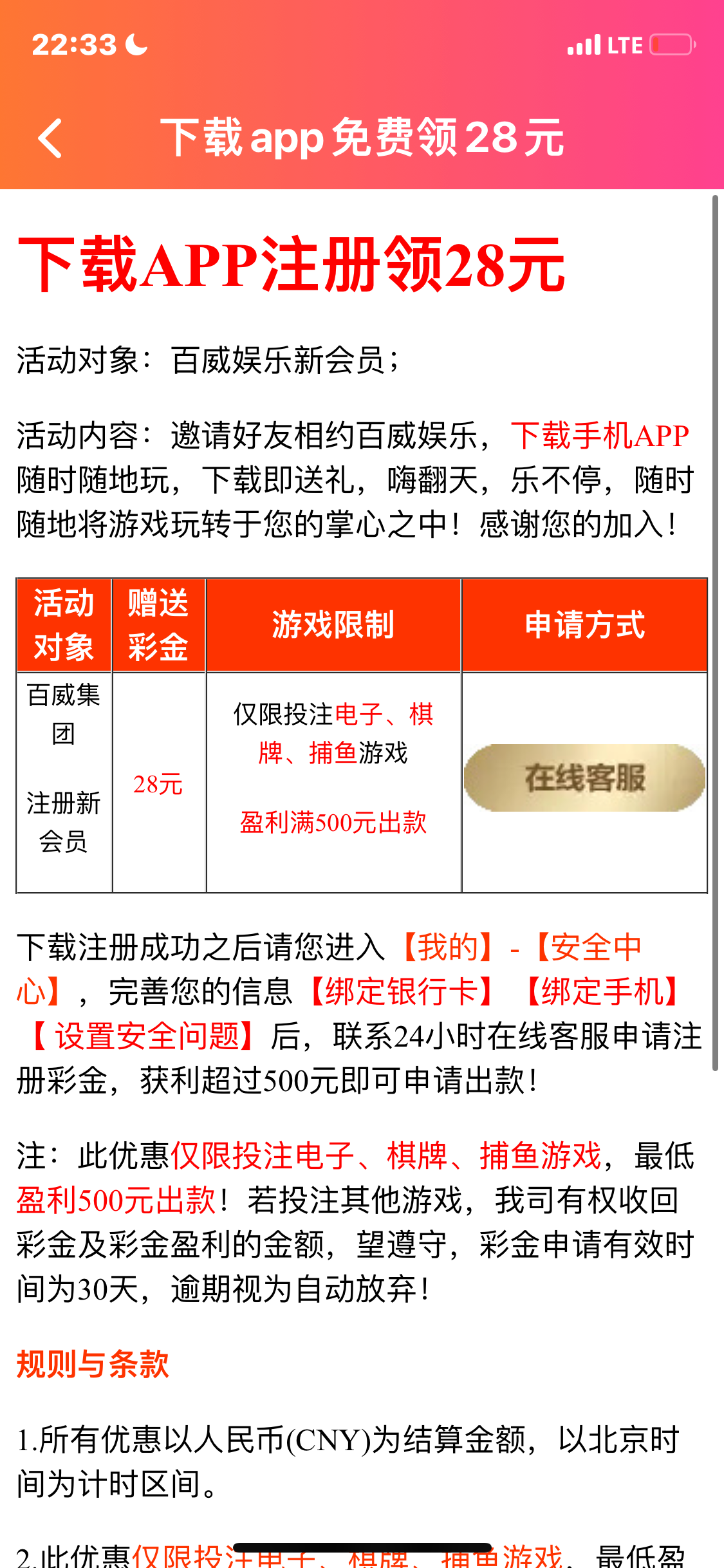 新用户下载APP注册绑卡完善所有资料看图,然后联系在线客服自助申请28/500提,彩金只能玩电子棋牌捕鱼。