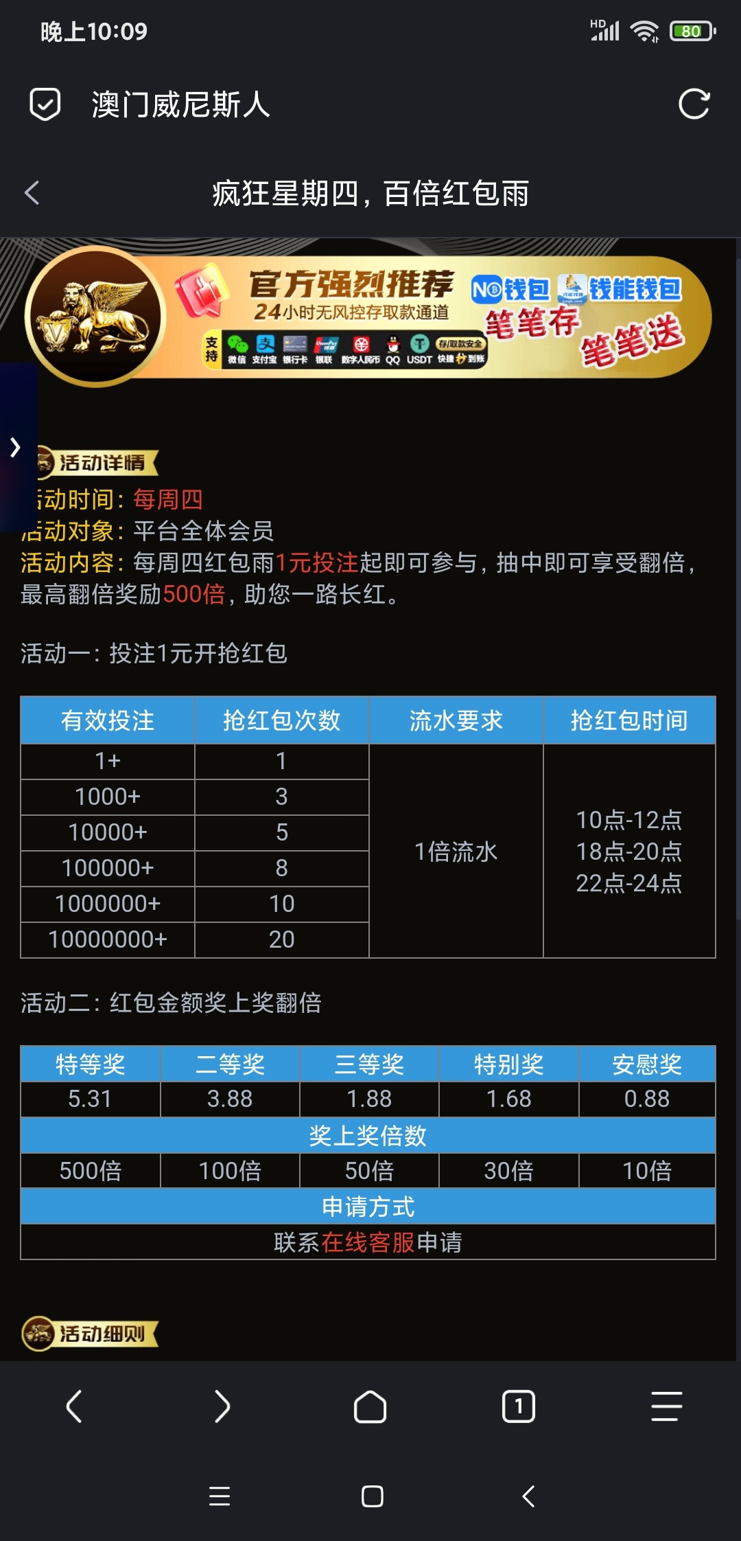 可以绑个钱能什么的里面不放很多钱的钱包,每周四余额划转个三块五块的参与这个活动,最低8.8,就当是以小博大1+8.8吧,一倍水不能彩票。