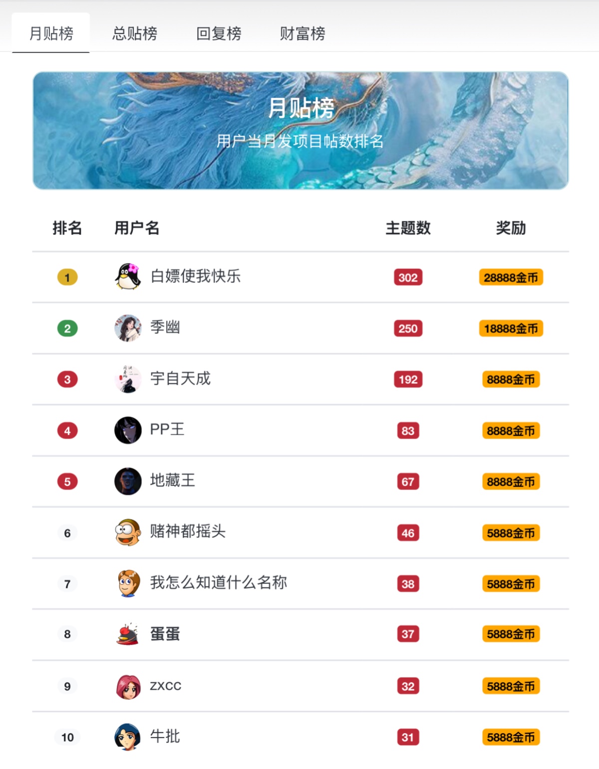 对当月发帖和活跃用户进行嘉奖