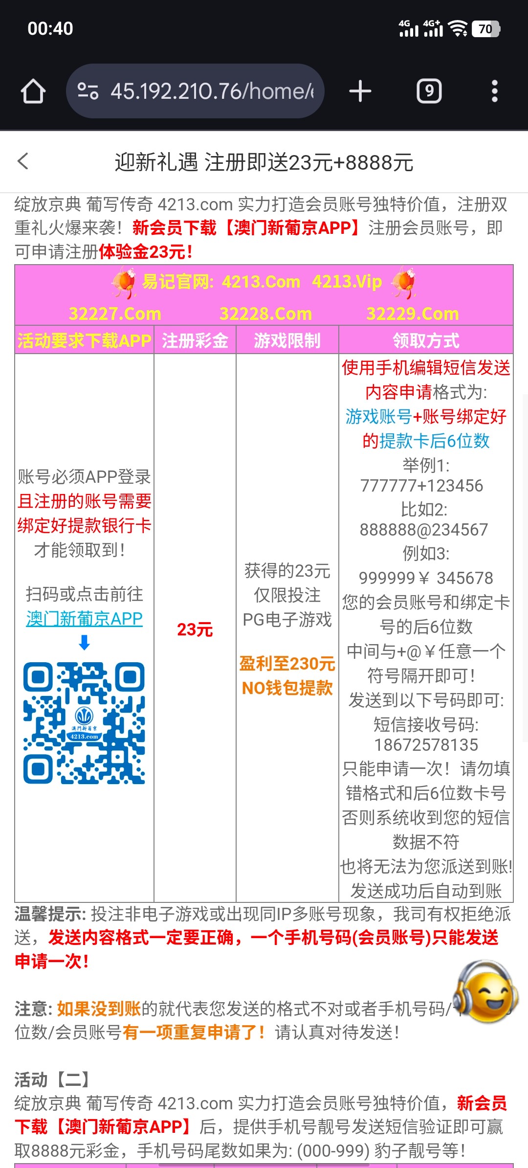 下载app 完善个人信息 发送短信自助23元彩金 盈利满230出 限制no钱包出