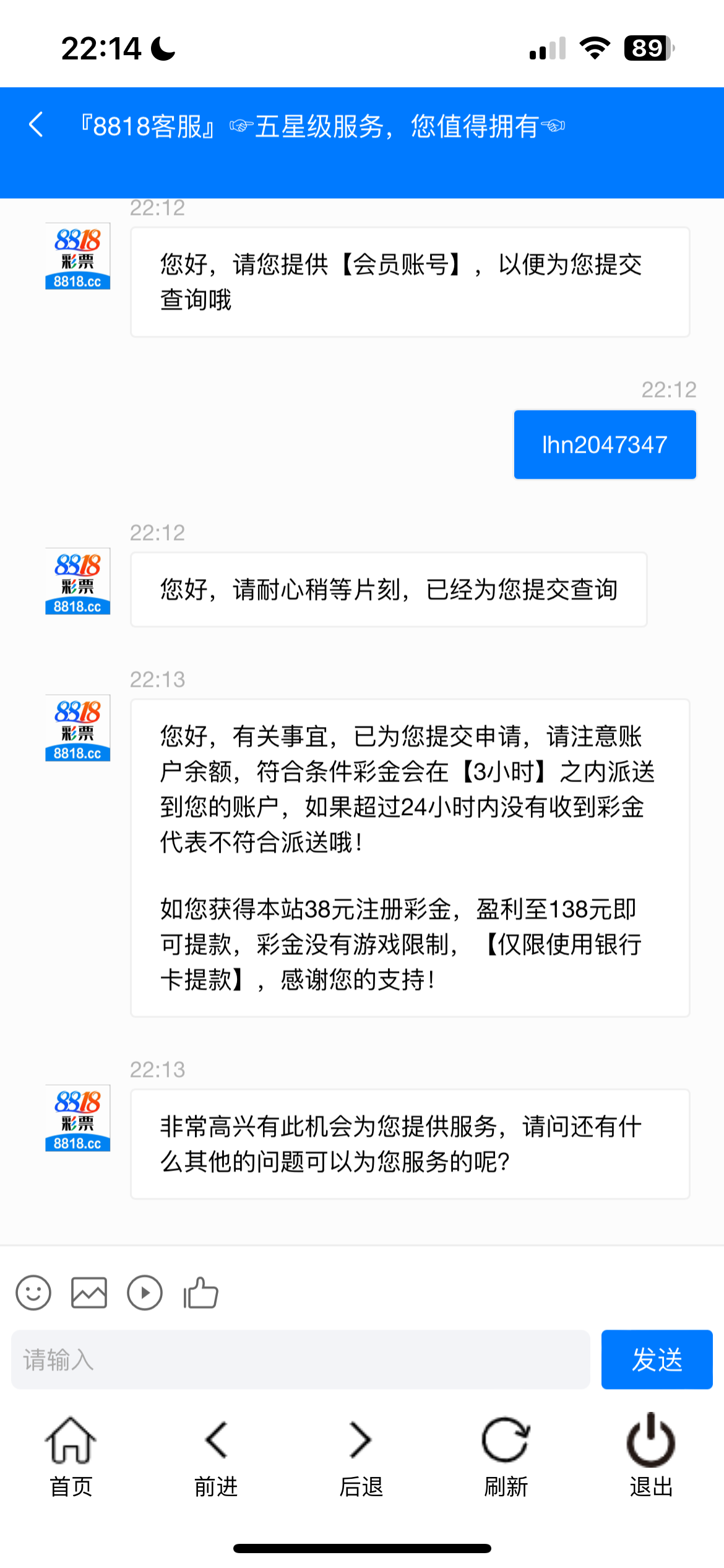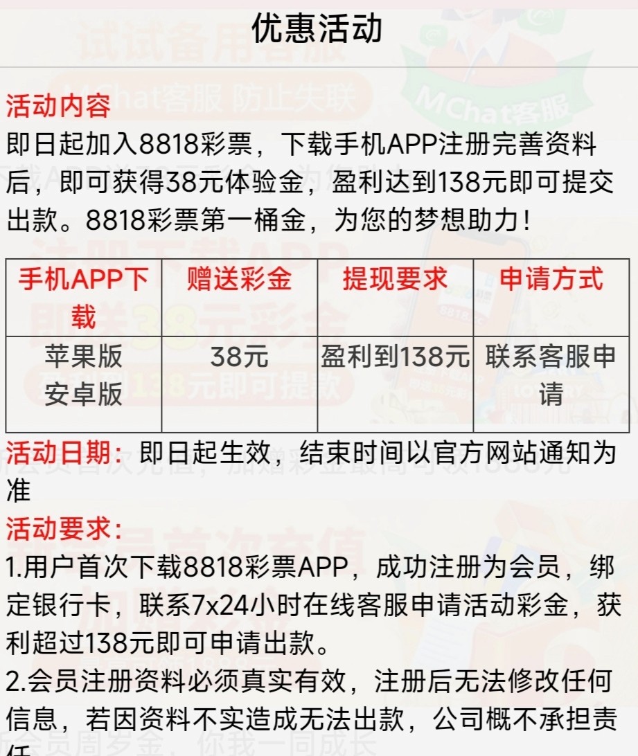新用户下载APP注册完善信息,联系在线客服申请38彩金。138即可提现。具体自测